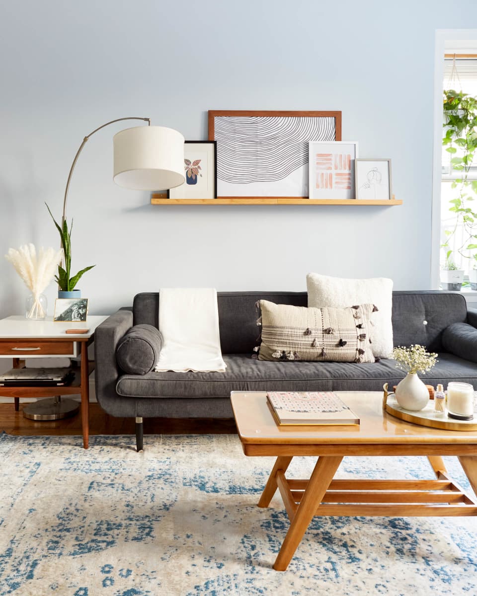 How can you add color while keeping an airy, open feeling in a small space? Look to nature. Erin’s apartment in Sunnyside, Queens, had good bones and cozy, comfortable furniture, but the walls were a drab renter’s white. Her style is rooted in earthy textures, with light woods and plenty of plants. So, naturally, she painted her living room walls in Light Drizzle by Behr® Paint — a sky-blue backdrop that’s a breath of fresh air. Plus, it helps pull off some clever color tricks.
