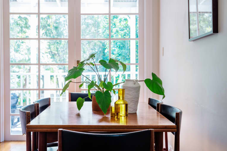 Now, I’ll be the first to admit that there’s nothing revolutionary or wildly innovative about this. Greenery has long served as a decorative accent for entry consoles, shelves, and windowsills, but there’s something to be said for a dramatic potted plant that can double as a focal point of a coffee table or dining room. Just practically speaking, the idea of constantly going out and buying fresh flowers may seem great in theory, but it’s not always viable. “Everyone loves a fresh-cut bouquet, but purchasing new blooms every week can add up and become quite costly,” says designer Tiffany Leigh. “If you want the feeling that fresh flowers bring, a potted plant can be the way to go while saving you a lot of money!”