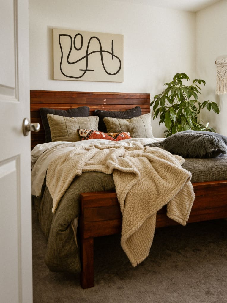 A pairing that’s as contemporary as it gets, the rich shade of chocolate brown found by way of the Euro shams in this dreamy bedroom offers an effortless complement to the olive-toned bedding. Together, this couple channels a moody, earthy vibe that’s further accentuated by the dark wood bed frame and the cozy layers of neutrals. Don’t pass on chocolate brown for your bedroom; it’s stunning and sophisticated while still offering plenty of softness and warmth.