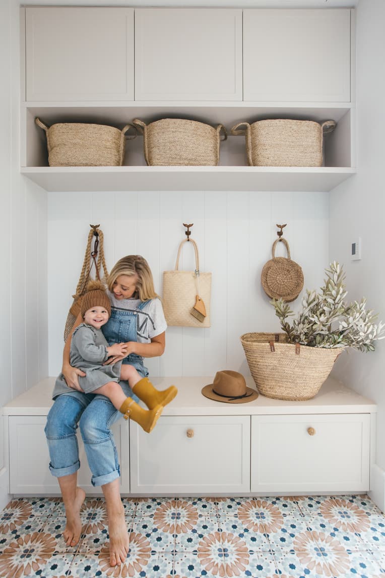 Australian design duo Kyal and Kara created their soothing mudroom with a mix of open and closed storage. The shelves house baskets that make grabbing daily necessities easy while bringing in texture and warmth. And the closed-off cabinets hide the clutter. “We enter this mudroom via our garage, and it was designed to be a super-practical area to store shoes, hats, jackets, and bags,” explains Kara. “Having a big drawer for each kid has worked really well.” Another smart (and pretty!) addition is the sweet watercolor tiles. “The tiled flooring is hardwearing and easy-to-clean, a great option with kids — especially as an entryway for a home with timber floorboards,” she says.