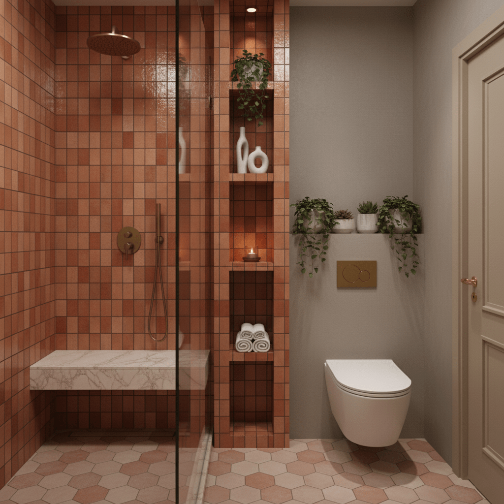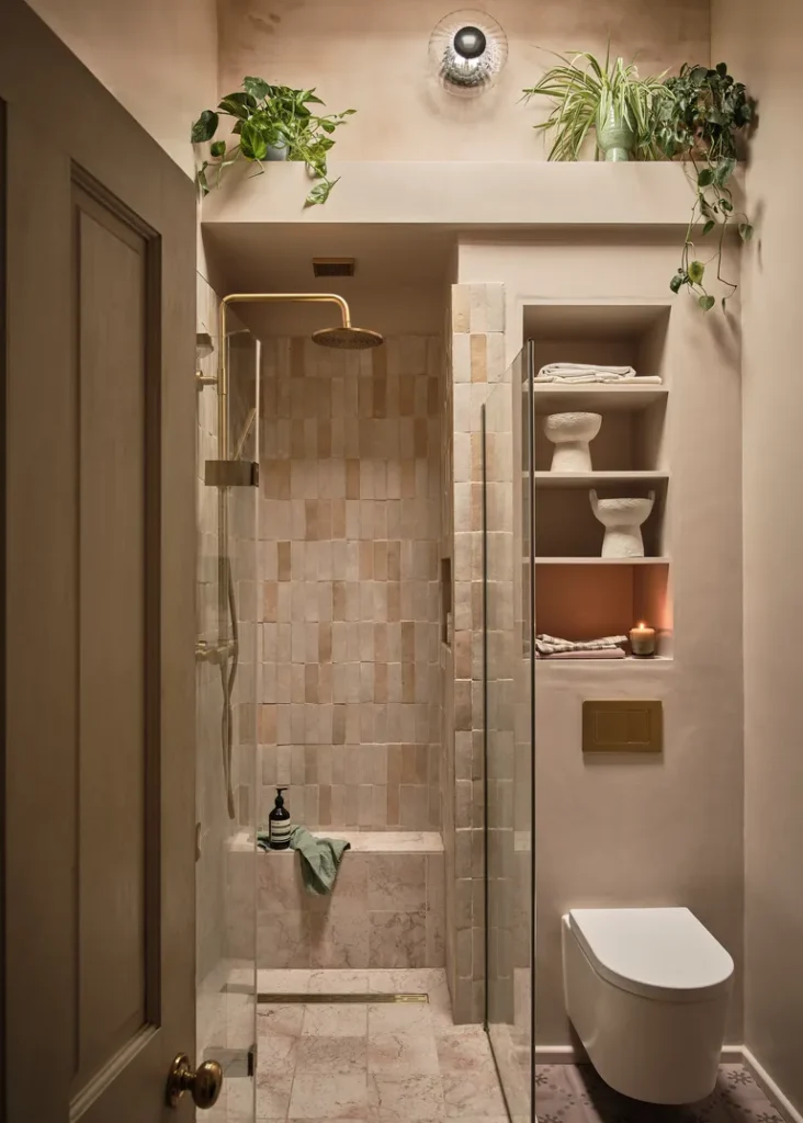 The room glows with soft pinks and terracotta undertones, balanced by the lush green of plants spilling from a shelf above the shower. The entire space hums with quiet luxury — not the cold perfection of a spa, but the laid-back comfort of a Mediterranean guesthouse.
