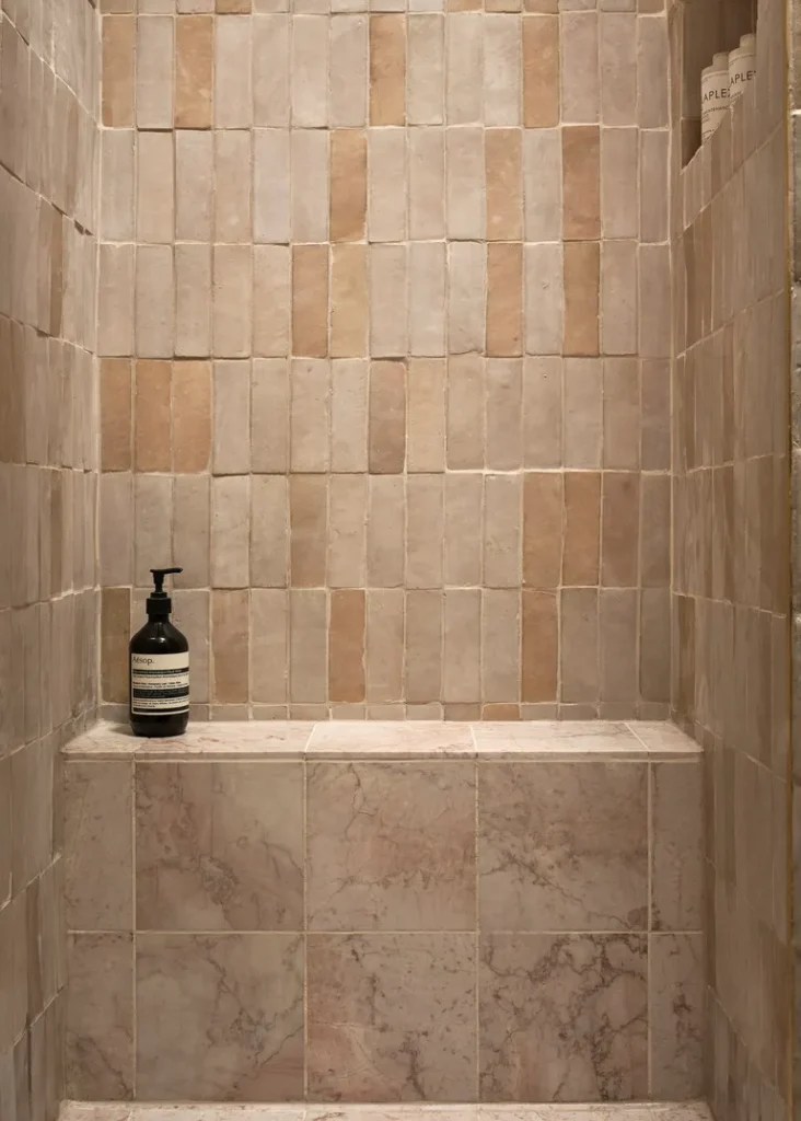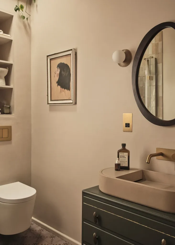 Her tiny bathroom Balearic design finds its harmony in natural materials. Low-VOC paint from Lick coats the walls in a soft blush tone. Handmade tiles from Bert & May — marble, bejmat, and encaustic — mingle in gentle contrast. Each tile catches light differently, building a symphony of texture.